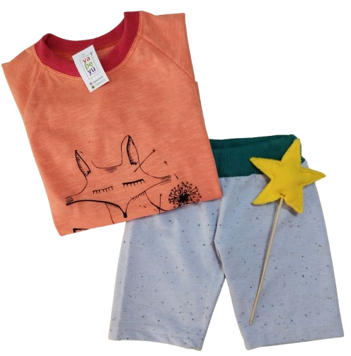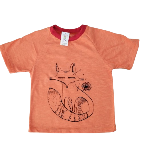 Remera de algodón color naranja melange o coral con mangas corte raglan. Cuello naranja